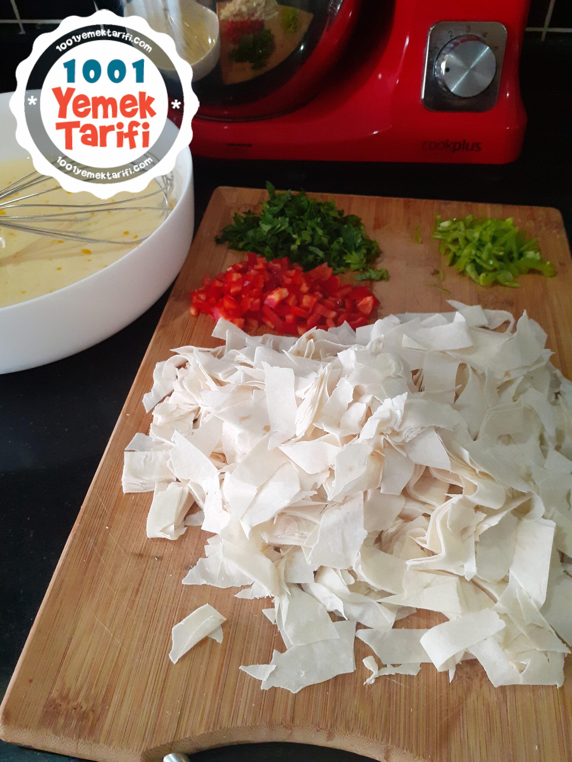 - Yufkakarımızı da ufak ufak doğrayıp ekliyoruz karışıma.