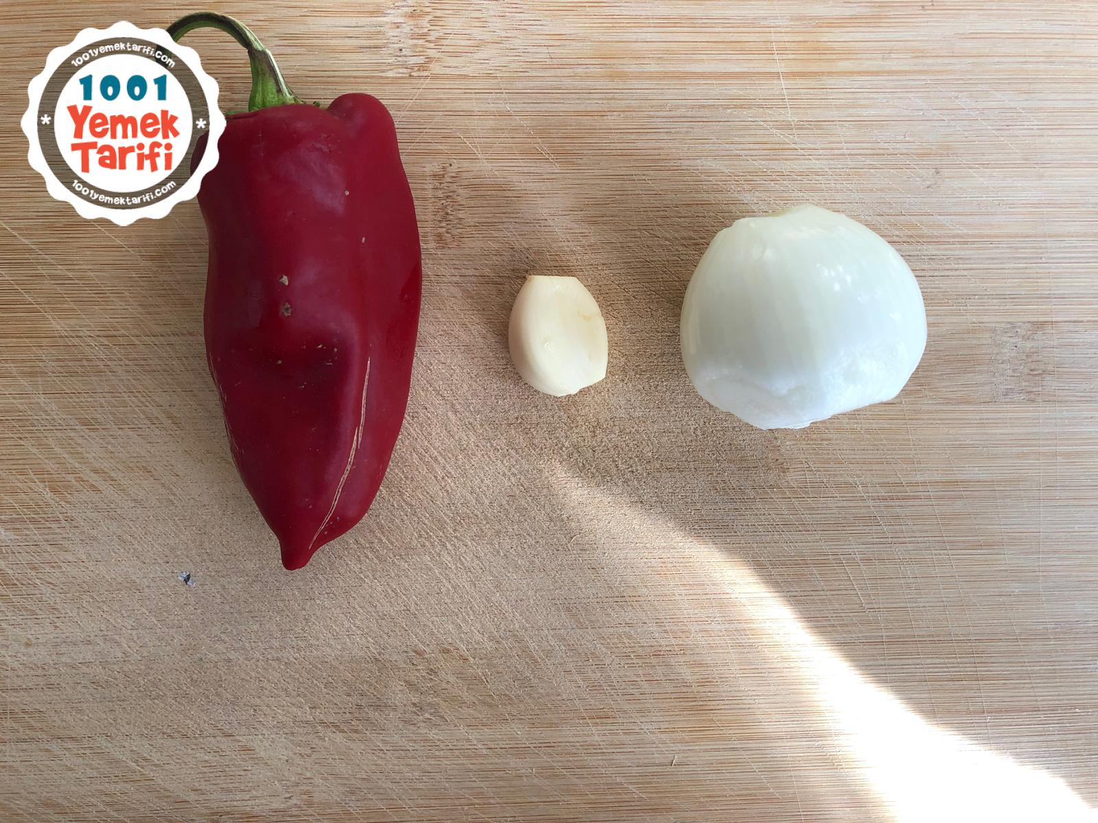 - -O sırada kırmızı kapya biber , soğan ve bir diş sarımsağı doğrayalım ve 2 yemek kaşığı zeytinyağında kavuralım.