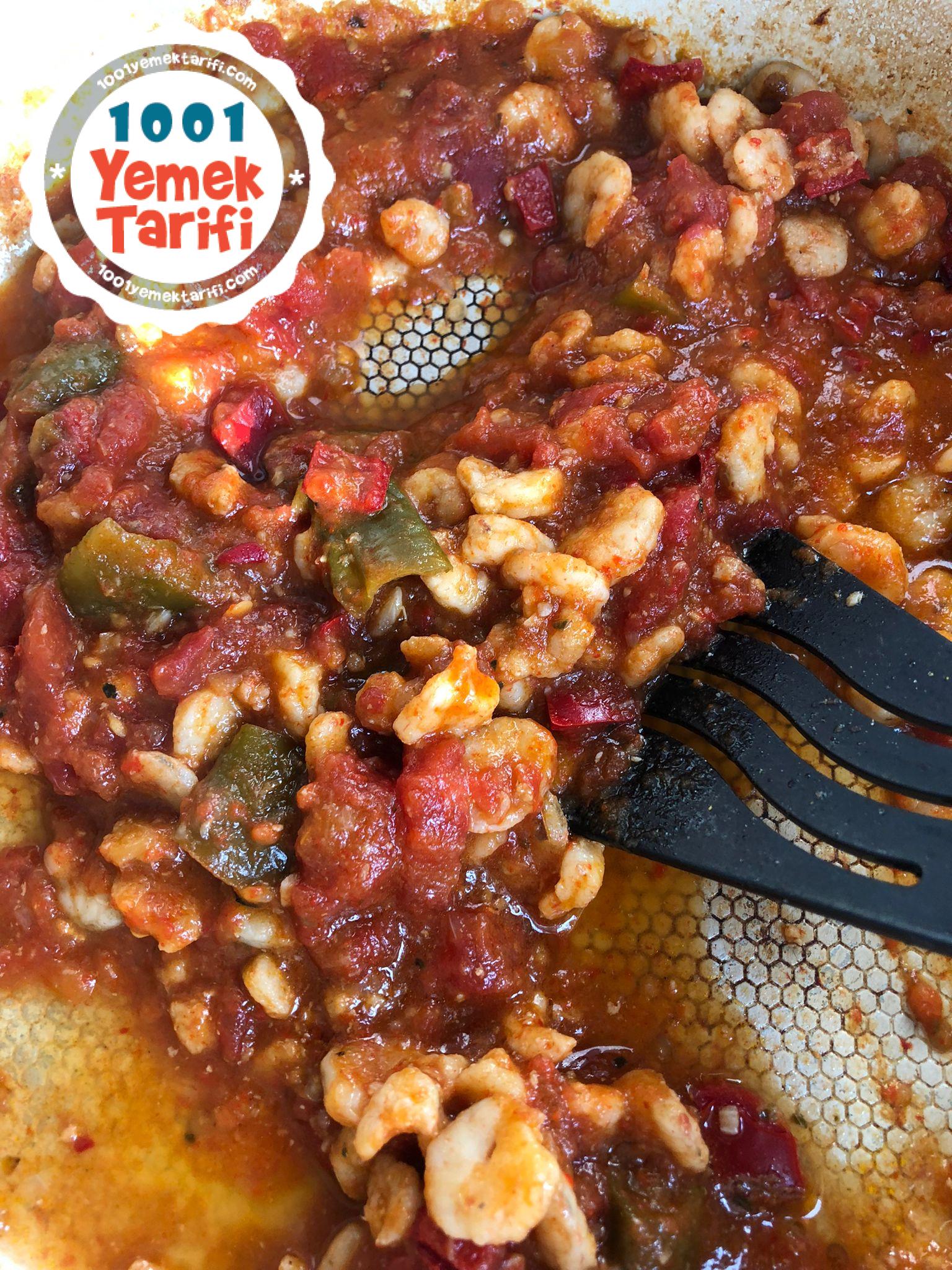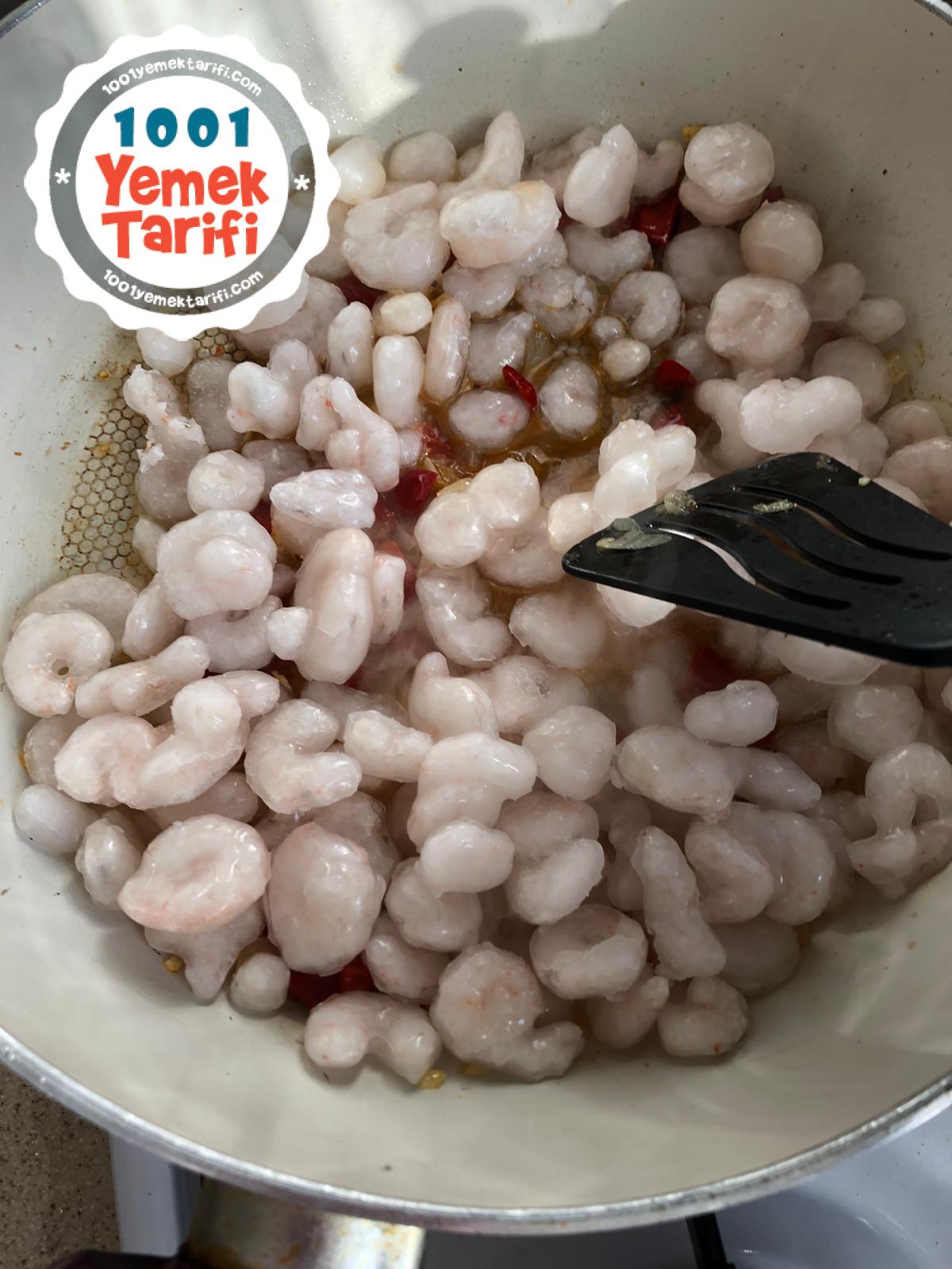 - -Donmuş Karidesleri çözdürmeden kavrulan soğan, sarımsak ve kırmızı biberlerin içine ekleyelim ve suyunu salıp çekene kadar kavuralım.