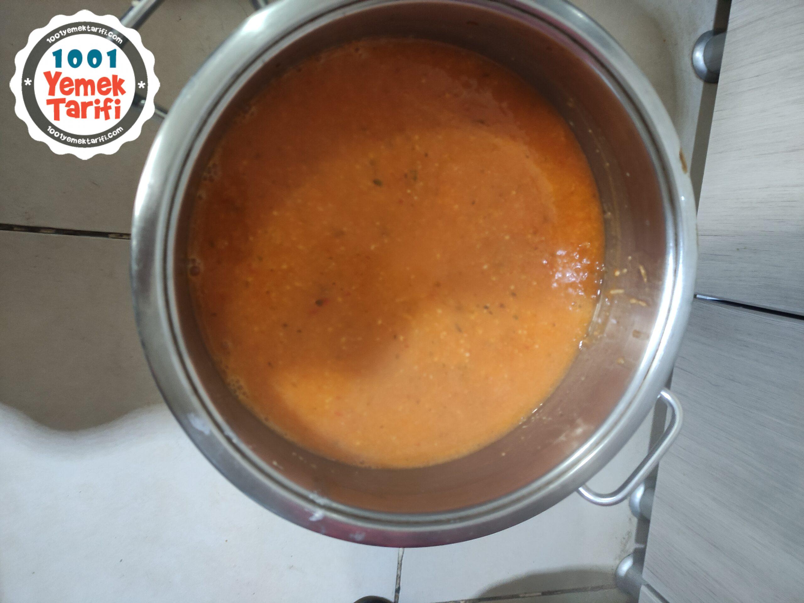 • Su ile açtığımız tarhanayı ekleyip üzerine geriye kalan 4 bardak suyu ilave edip karıştırarak pişmeye bırakıyoruz