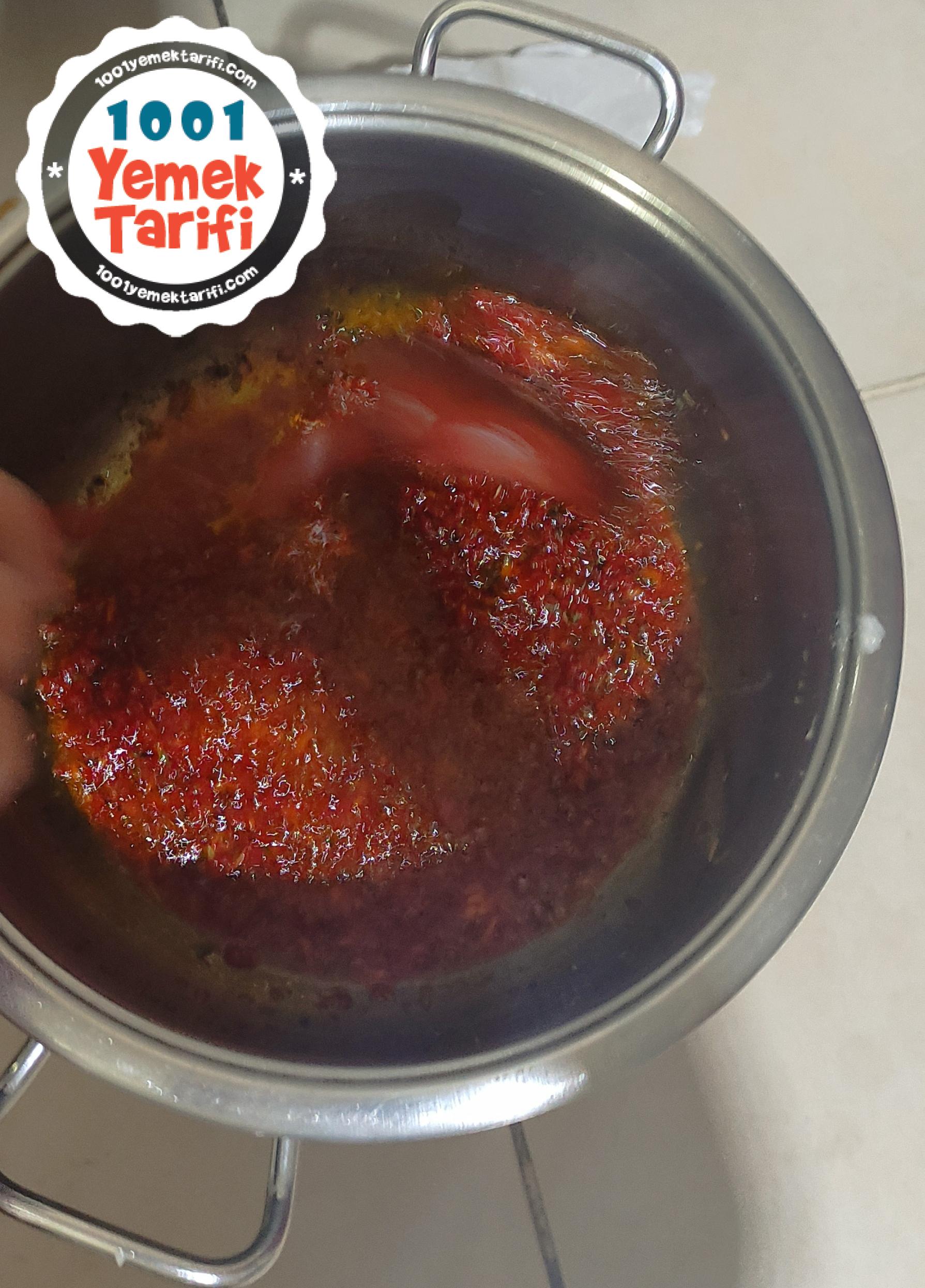 • Daha sonra salçalarımızı ekleyip kokusu çıkana kadar karıştırıyoruz