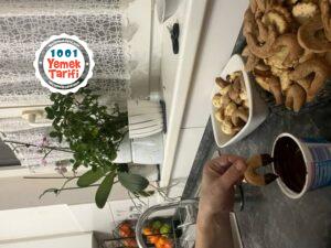 - İyice soğumuş olan çikolatalı ay kurabiyeleri süslemek için sivri uçlarını çikolata sosuna batırın.