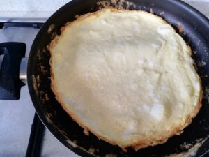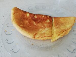 - Sonrasında kapağı açın ve bir taraftan diğerinin üstüne kapatın 2 dakika daha pişirip ocaktan alın. Pofuduk ekmek gibi yağsız omletiniz hazır. Afiyet olsun.