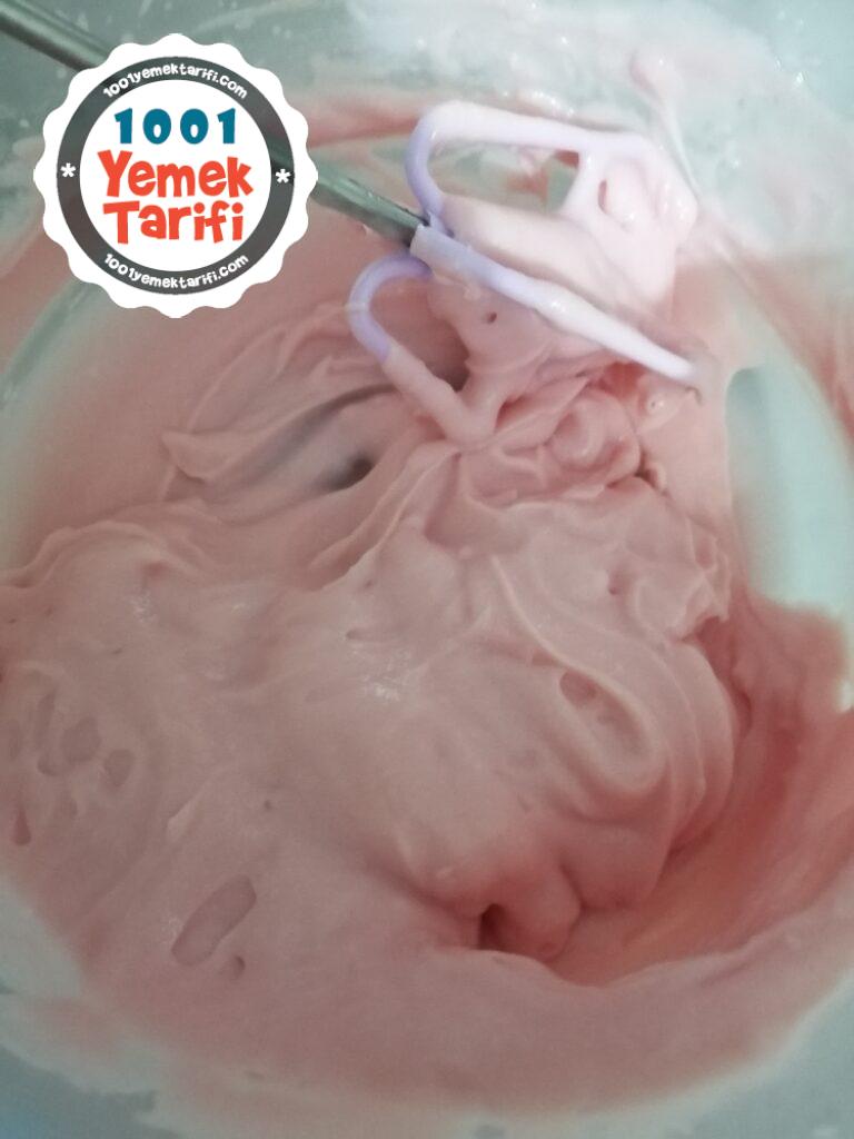 - Kek pişerken 2 su bardağı süte toz halinde olan çilekli kremayı soğuk sütte kıvam alana kadar çırpalım .