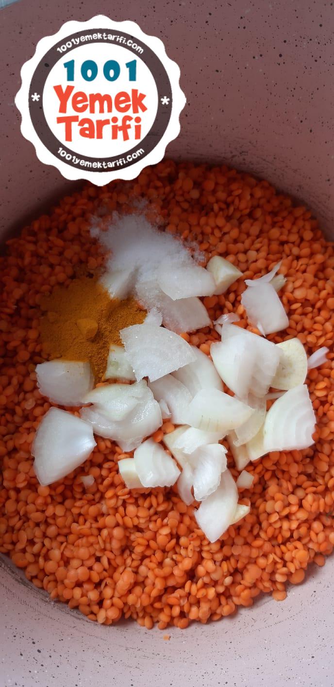 • İlk olarak mercimeği yıkamayla başlıyoruz yıkadığımız mercimekleri tenceremize alalım üzerine soğanları rast gele doğrayalım
