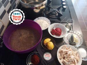 • Kavrulan ve soğuyan unu iki su bardağı su ile pürüzsüz bir şekilde çırpalım ve salçalı tavuk suyu ile birleştirip karıştıralım.