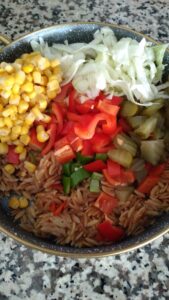 - Şehriye pilavımız soğuyunca üzerine doğranmış iceberg (göbek) marul, kapya biber, kornişon turşu, yeşil biber ve konserve mısır ilave edip karıştıralım.