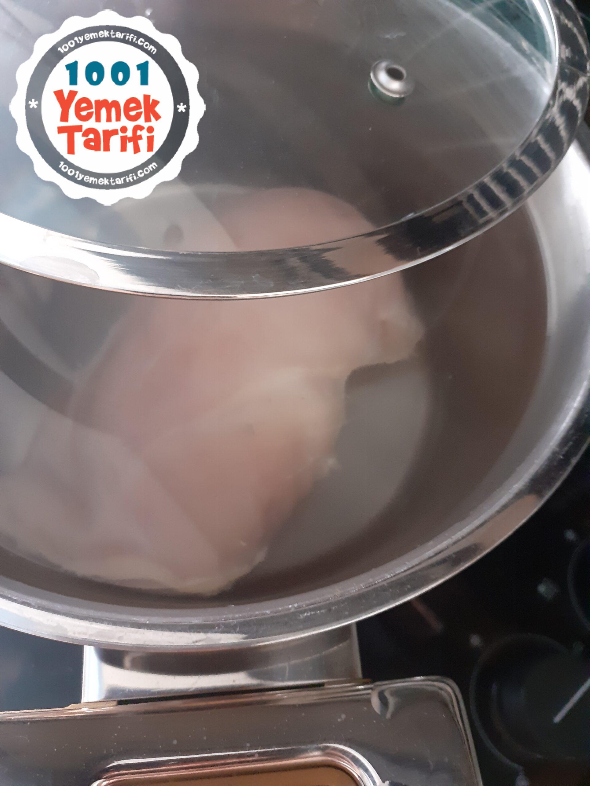 - Öncelikle 2 litre suyumuza tavuk göğsünü alıyoruz ve haşlıyoruz.