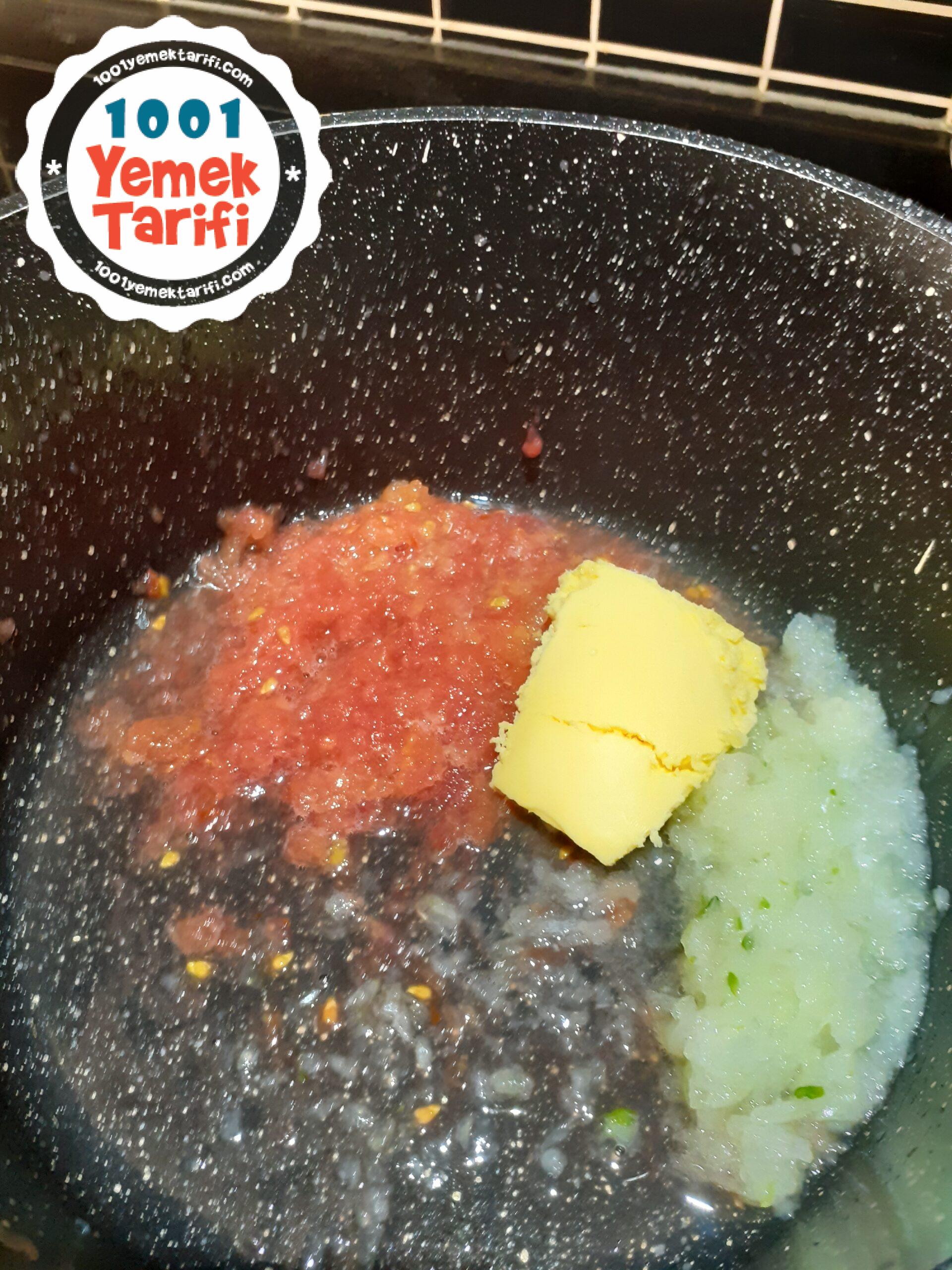 - Ardından tencereye soğan ve domatesimizi rendeliyoruz.