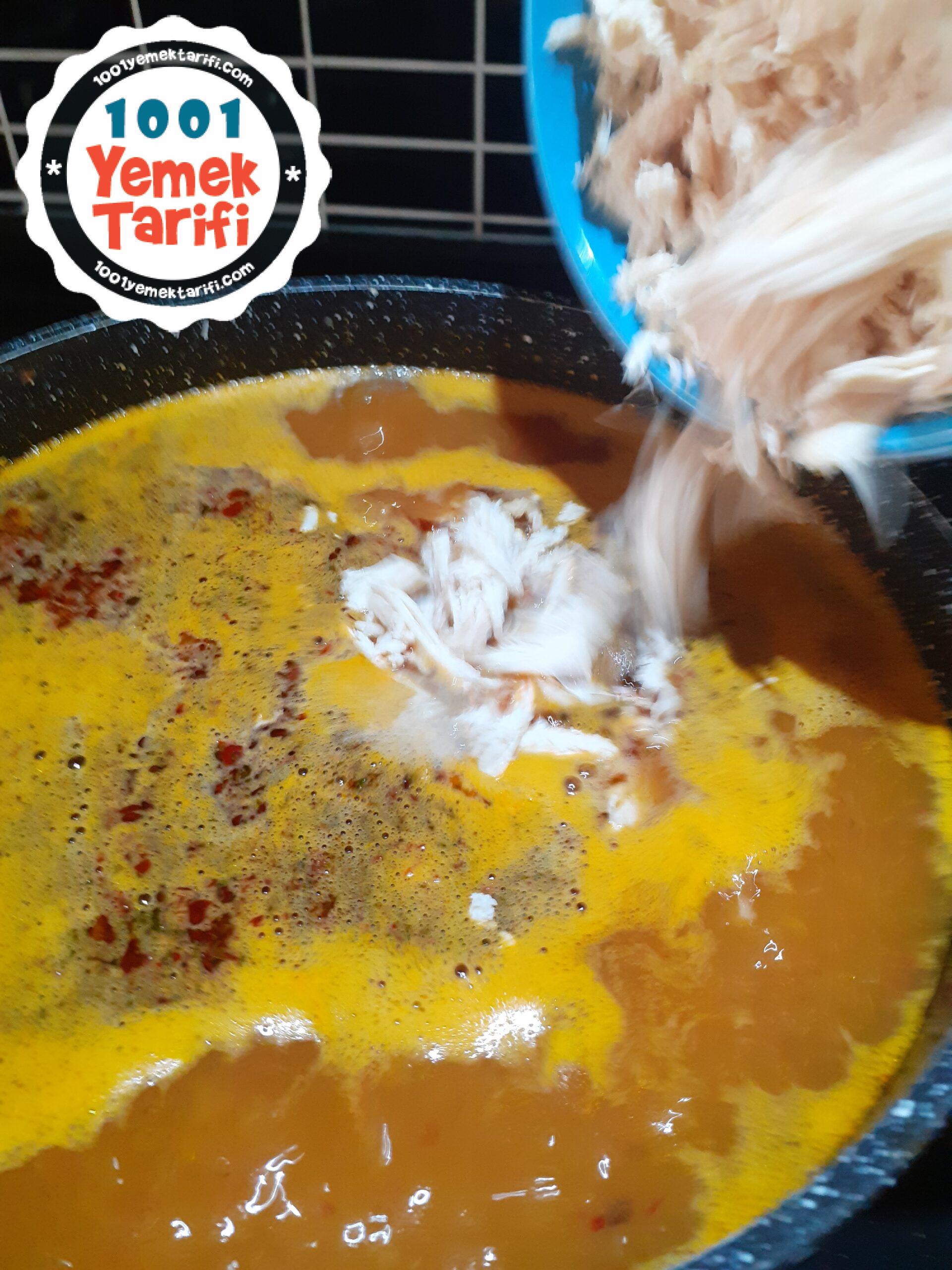 - Kaynayan çorbamıza didiklediğimiz tavuğu ve arpa şehriyeyi ilave ediyoruz ve pişmeye bırakıyoruz.