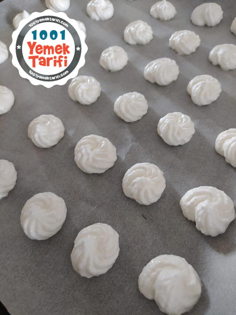 - Daha sonra karışımı sıkma torbasına alarak yağlı kağıt serili tepsimize istediğimiz şekilde sıkalım.