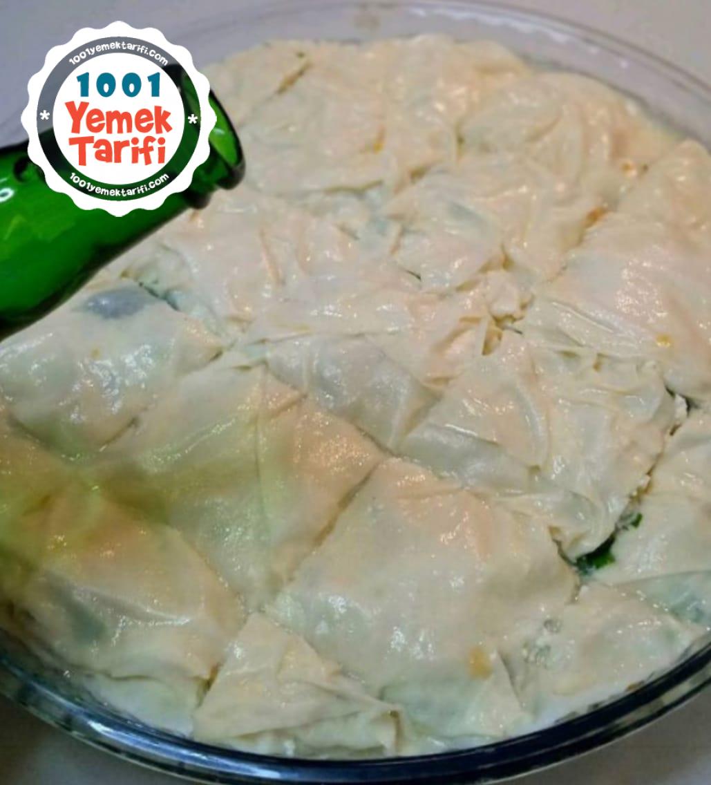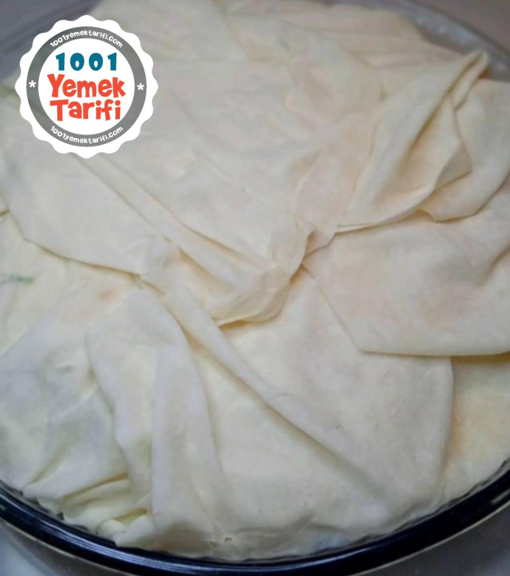 - 3.ARDINDAN YAĞLADIĞINIZ TEPSİYE BİR ADET YUFKAYI YERLEŞTİRİN VE HER BİR YUFKAYI PARÇALARA BÖLÜP TEPSİYE YERLEŞTİRİN.