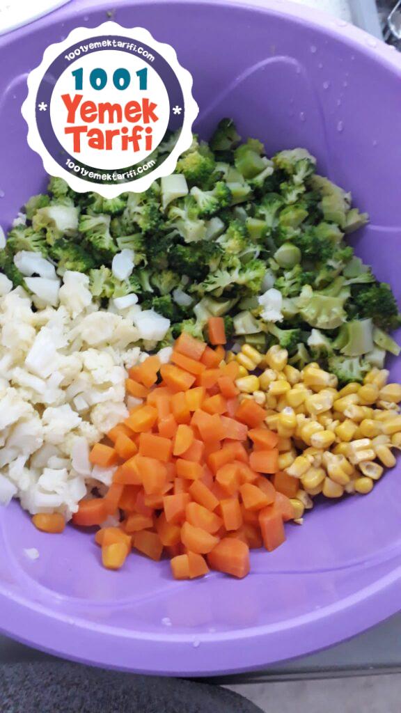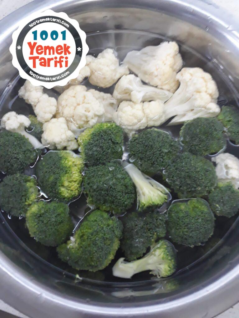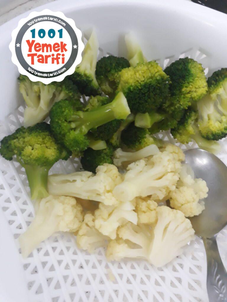 - Brokoli, karnabahar ve havuçları ayrı ayrı haşlayıp suyu süzülene kadar süzgeçte bırakalım.