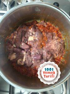 • Kuşbaşı doğranmış ciğerleri ekleyin ve hepsini karıştırın.