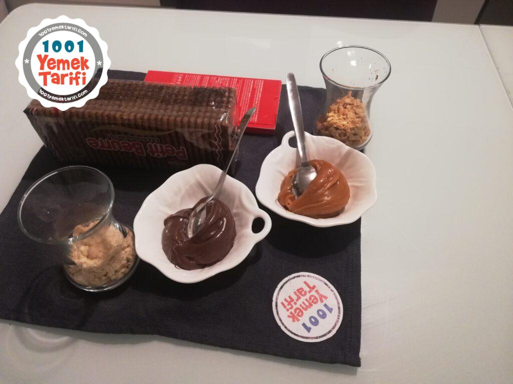 • Un haline gelen bisküvilerin yarısını bir kaba alıp üzerine 2 yemek kaşığı süt ve sürülebilir çikolatayı ekleyip karıştıralım