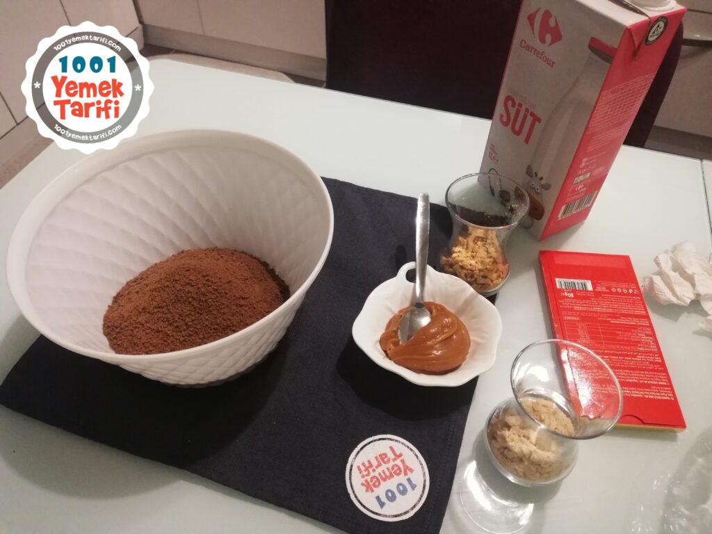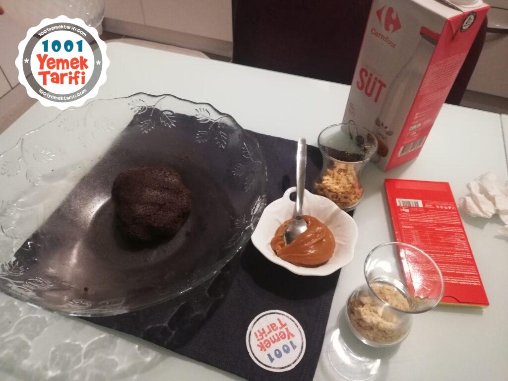• Kalan bisküvinin içine karamel sosu alalım 2 yemek kaşığı sütü de ekleyip hamur haline getirelim ve dolaba atalım