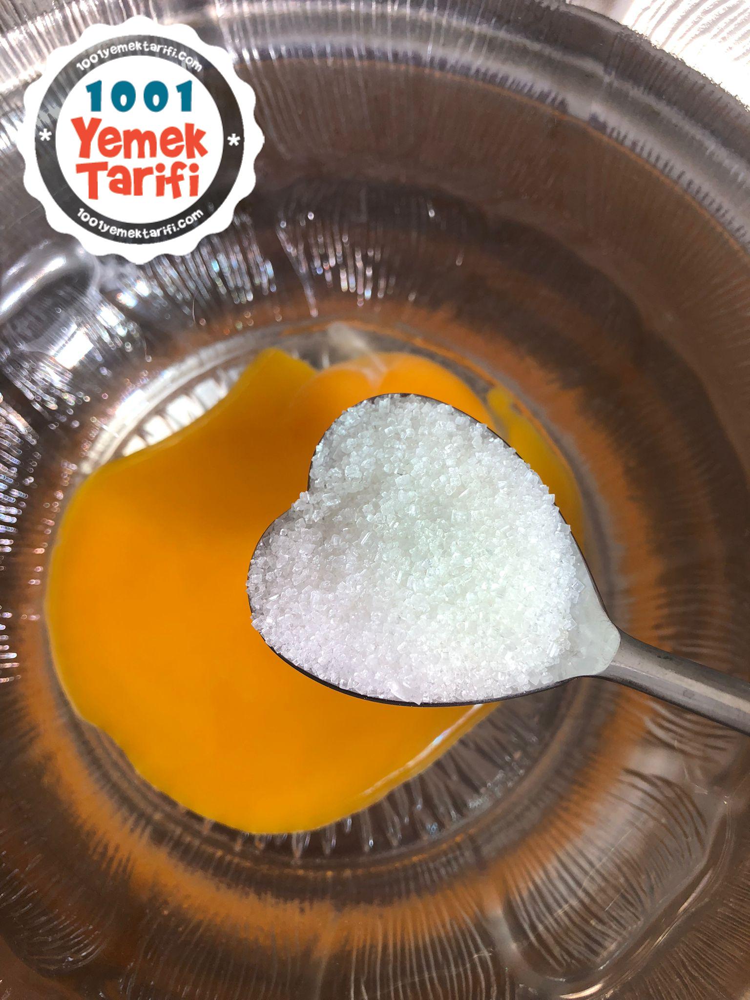 - -Bir kaba yumurta sarısı ve şekeri alıp bir çırpma teliyle çırpalım.