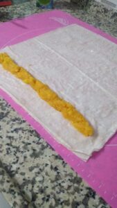 • Ardından resimdeki gibi ortasına rulo olacak şekilde patatesli harçtan koyalım
