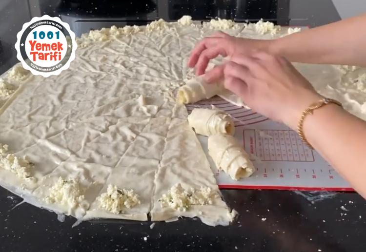 - 6=Soslu yufkanın geniş kenarına ucuna peynir koyalım ve düz bir şekilde rulo şeklinde saralım.