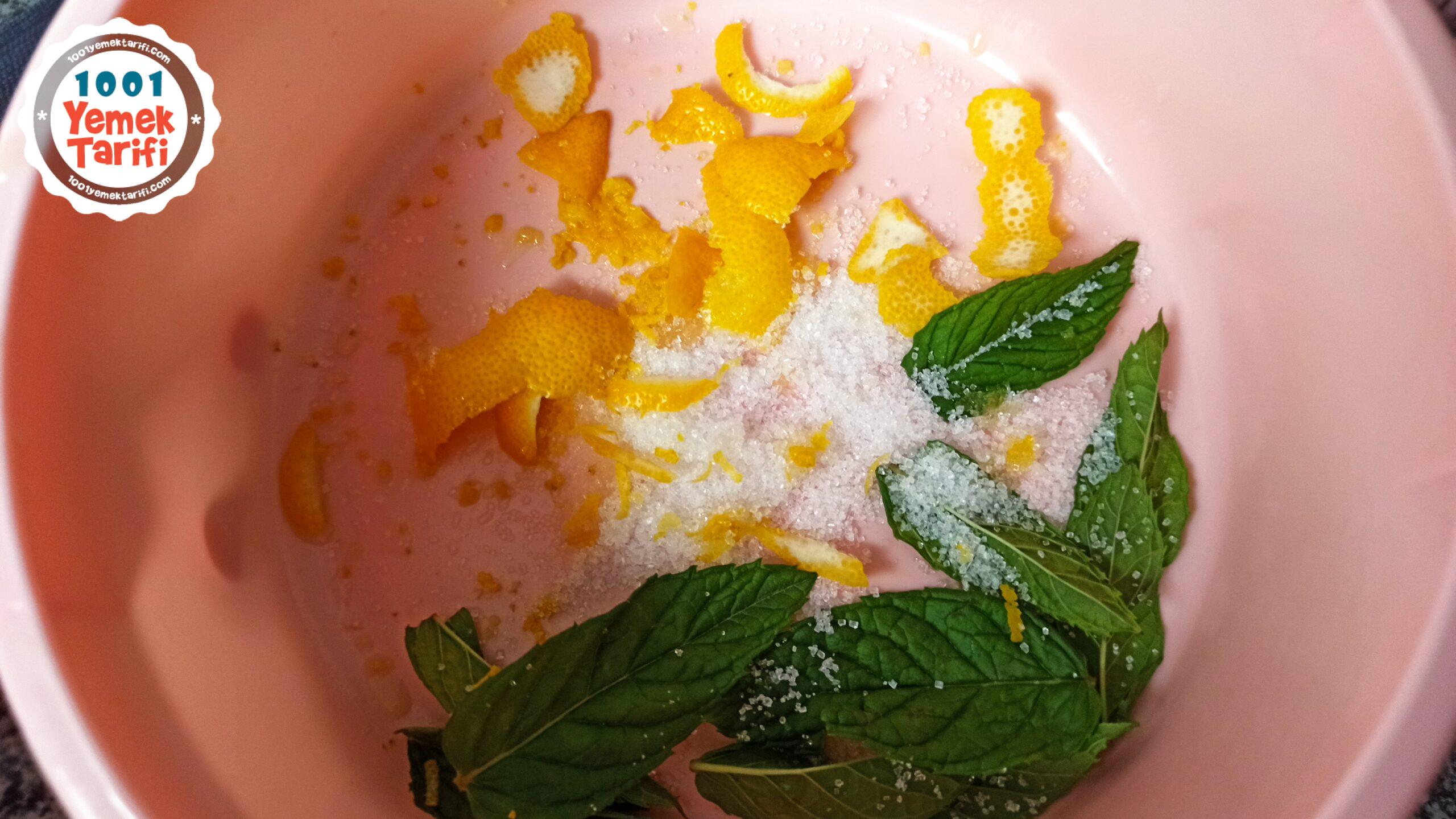 - Toz şekeri ve nane yapraklarını ilave edip elimiz ile güzelce ovalayalım.