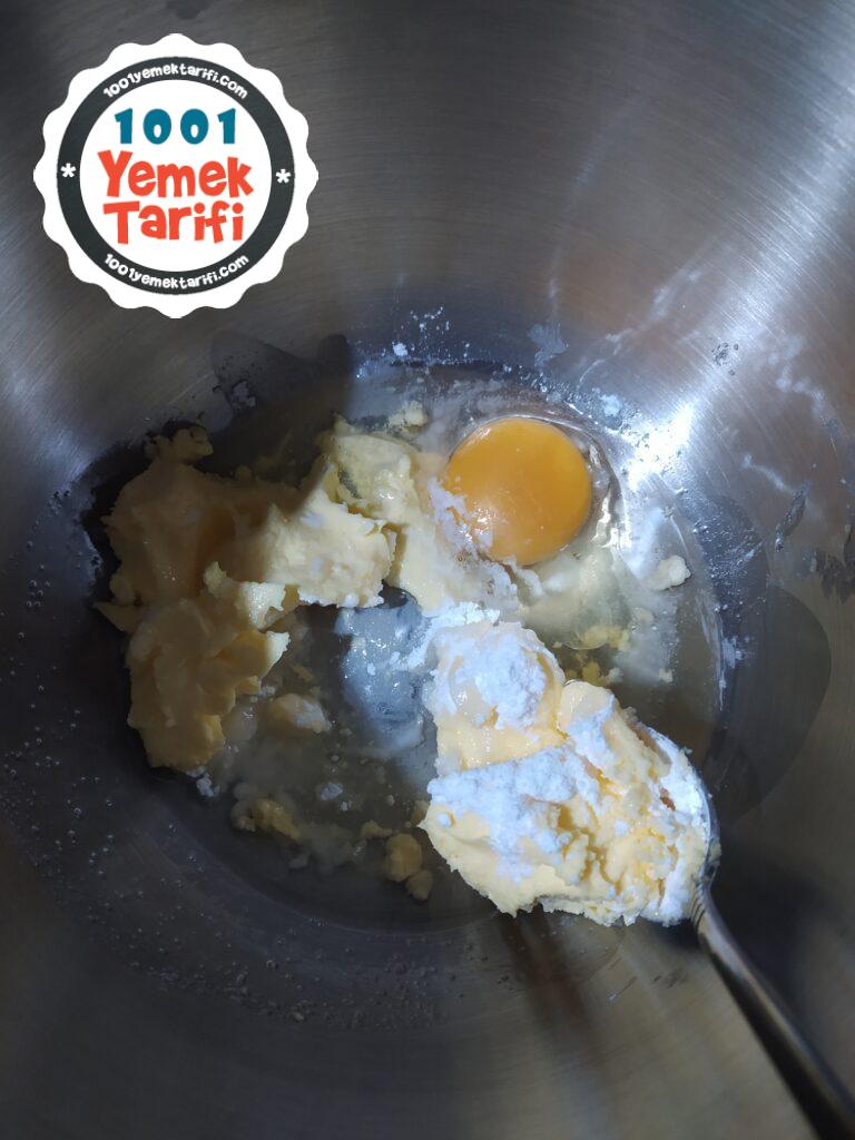 • Oda ısısındaki tereyağ sıvıyağ yumurta pudra şekeri bir kabartma tozu bir kaba alınıp karıştırılır.