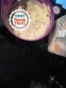 - 1 su bardağı damla çikolata, kabartma tozu ve vanilyayı ekleyip karıştıralım