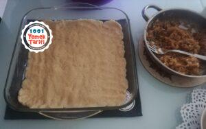 - Yağladığımız fırın kabına büyük hamurumuzu elimizle yayalım isterseniz oklava kullanarak açabilirsiniz