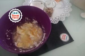 - Hamur için bütün malzemeleri karıştıralım. Kontrollü bir şekilde ununu ilave edelim ele yapışmayacak yumuşak bir hamur yoğuralım