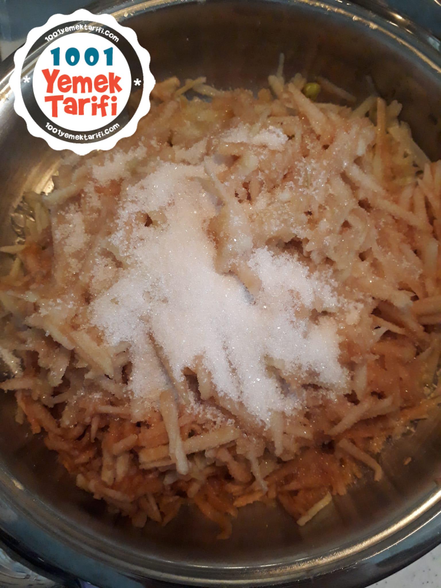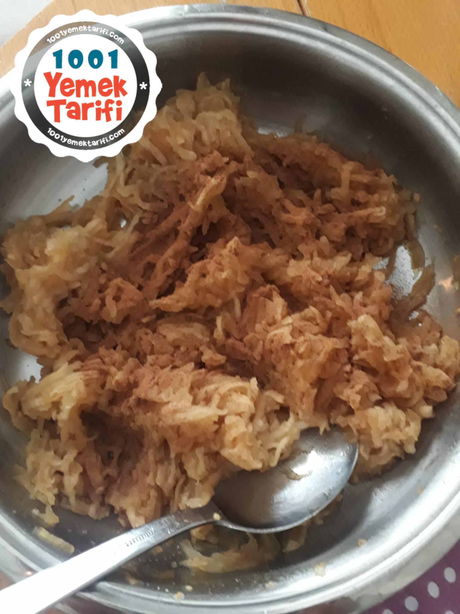 - Önce elmalı harcı hazırlayın. Elmaları rendeleyip tavaya alın