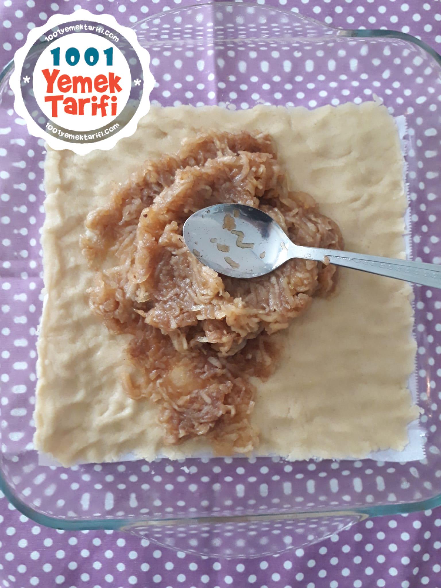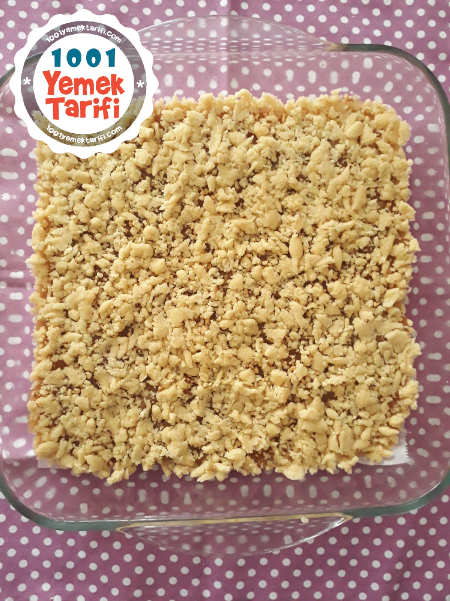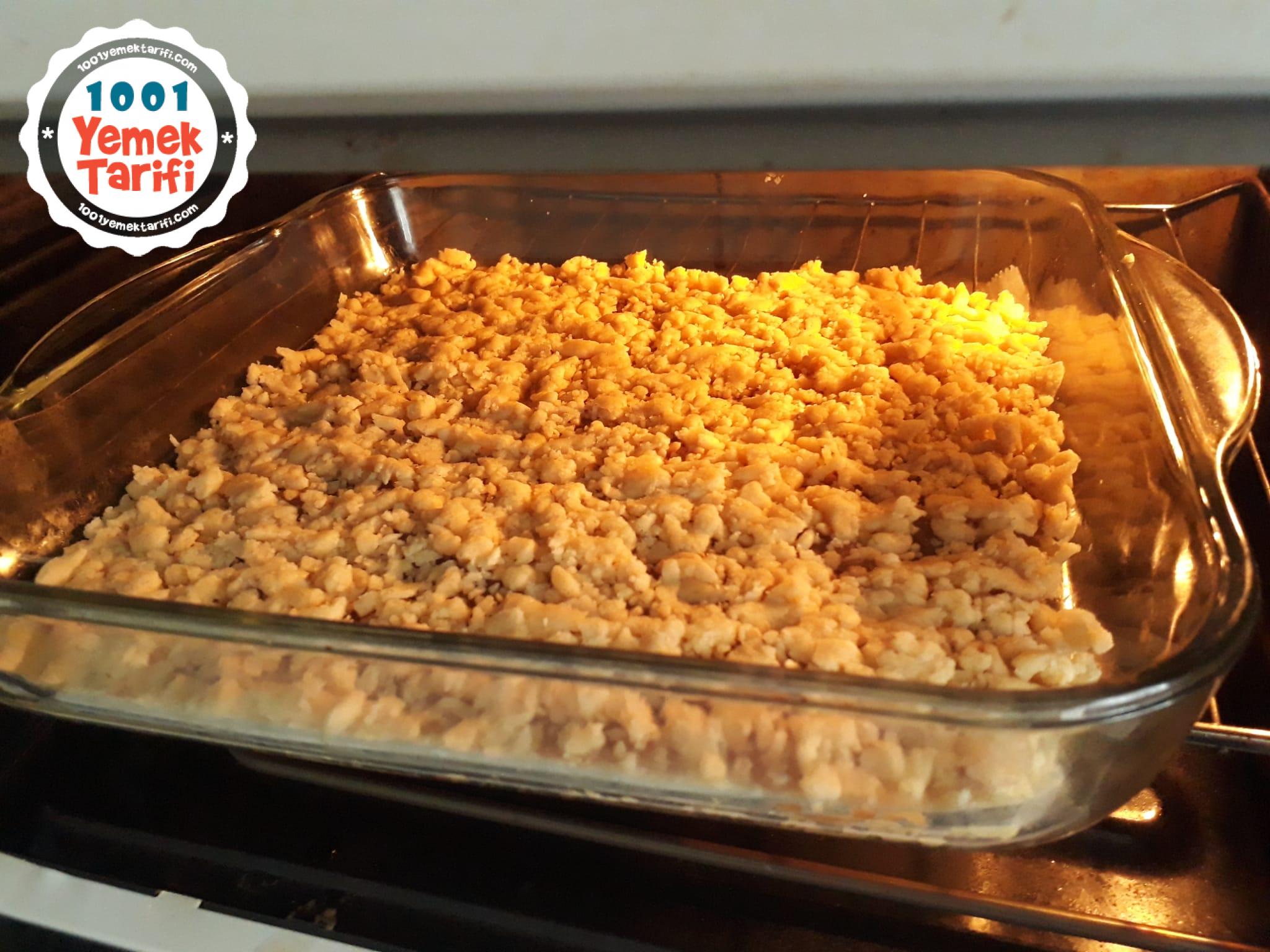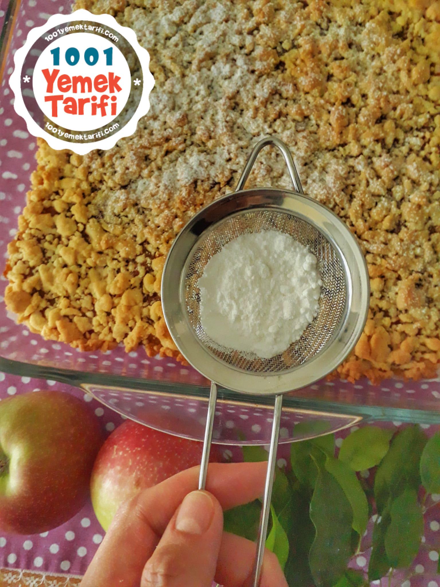 - Elma harcın üzerine kalan hamuru elinizle ufalayarak serpin.
