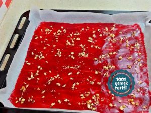- Islattığımız fırın kağıdını tepsiye serip üzerine erik pestilini döküyoruz güzelce yayıp güneşe kurumaya bırakalım.
