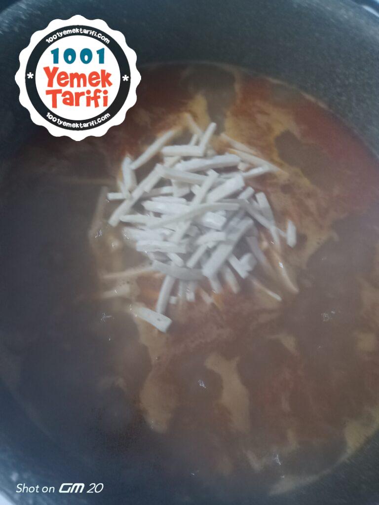- Mercimekler yumuşayınca muhtemelen tenceredeki su miktarı azalmış olacaktır. Bunun için 1 su bardağı daha su ekleyelim ve kaynadıktan sonra erişteleri ekleyelim.