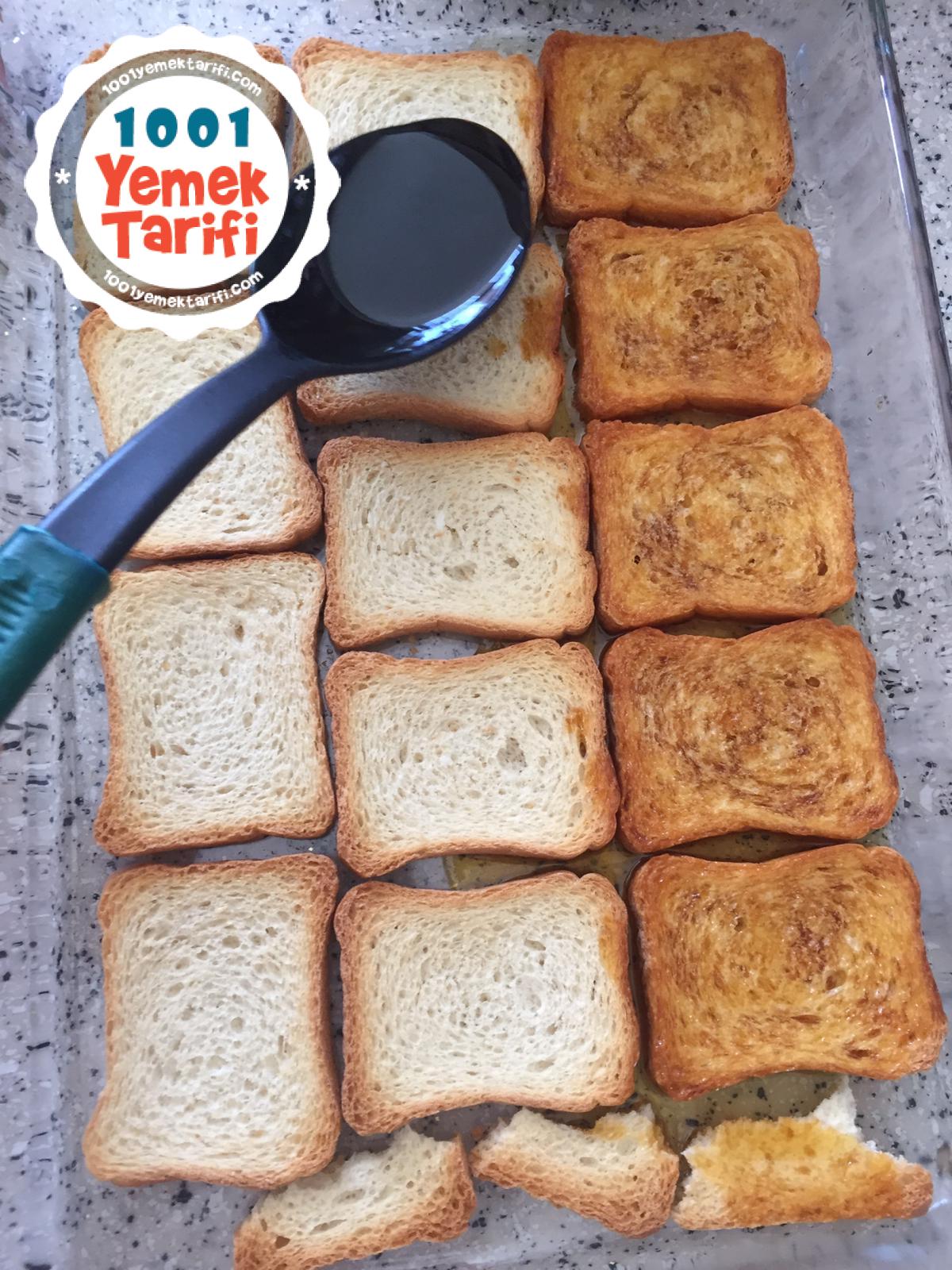 - Yaptığımız karameli etimek ekmeklerimizin üstüne dengeli bir şekilde dağıtalım. Görseldeki gibi.