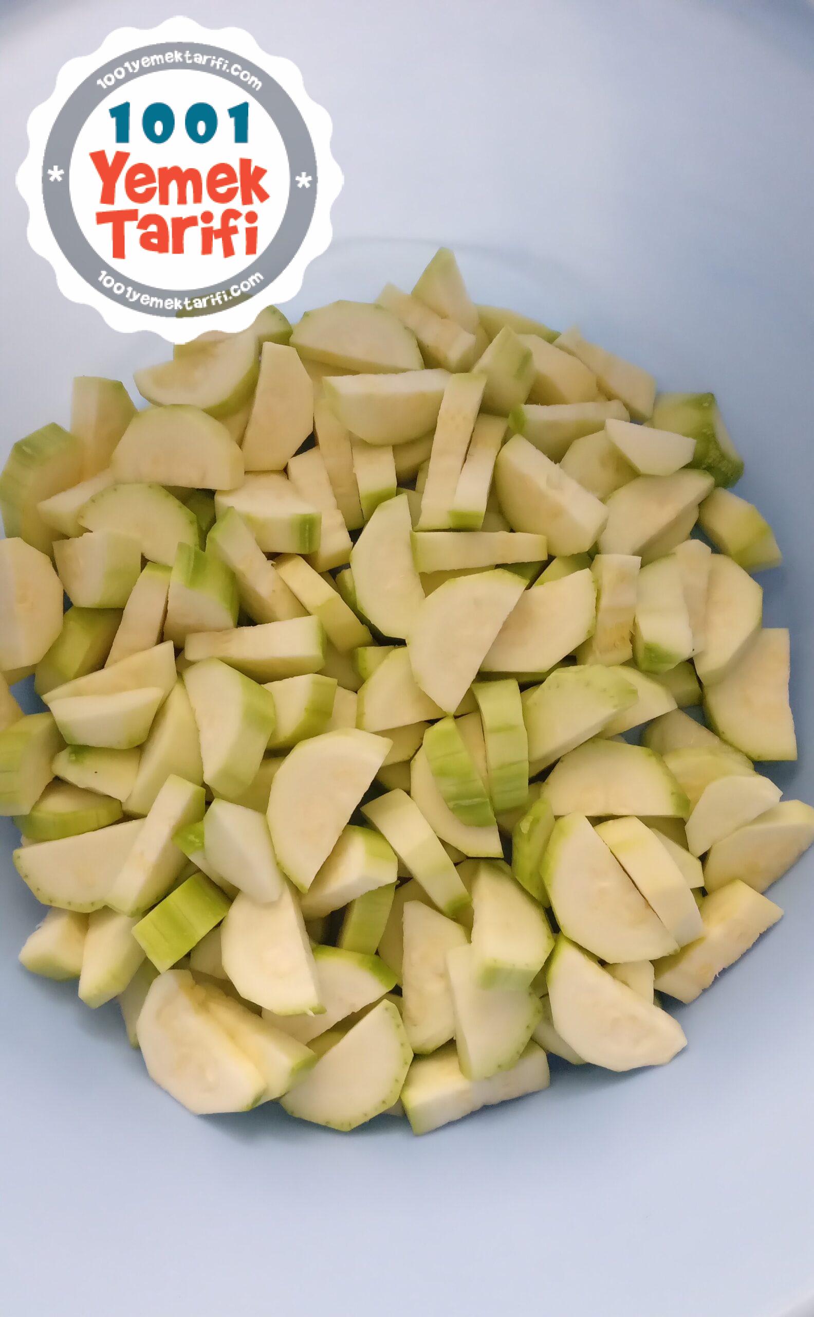 • Öncelikle kabakları soyup, yıkıyoruz ve yarım ay şeklinde doğrayıp hazırlıyoruz.