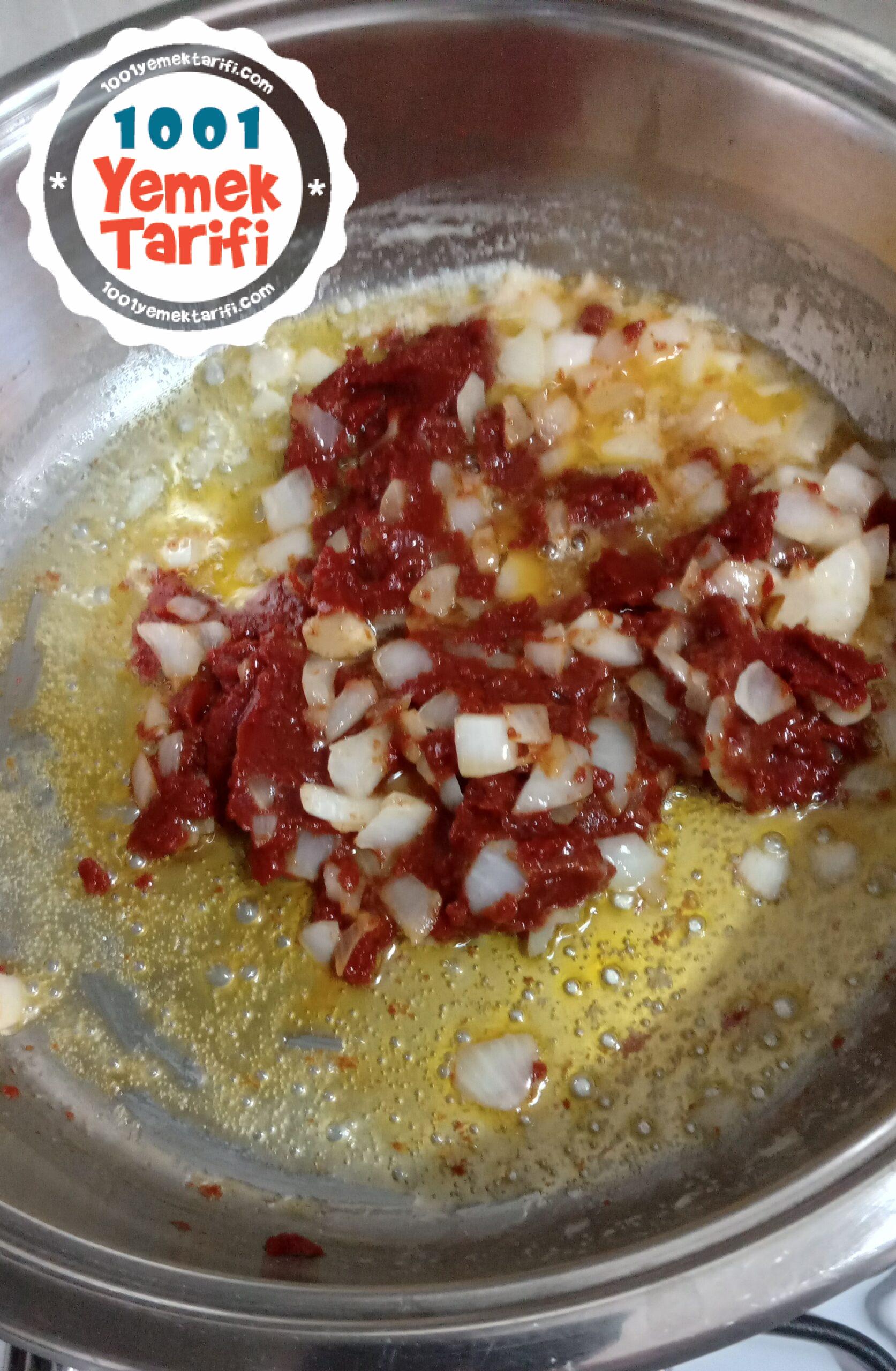 • Üzerine domates ve biber salçamızı, tuz, karabiber ve pul biberimizi de ekleyip kavurmaya devam ediyoruz.