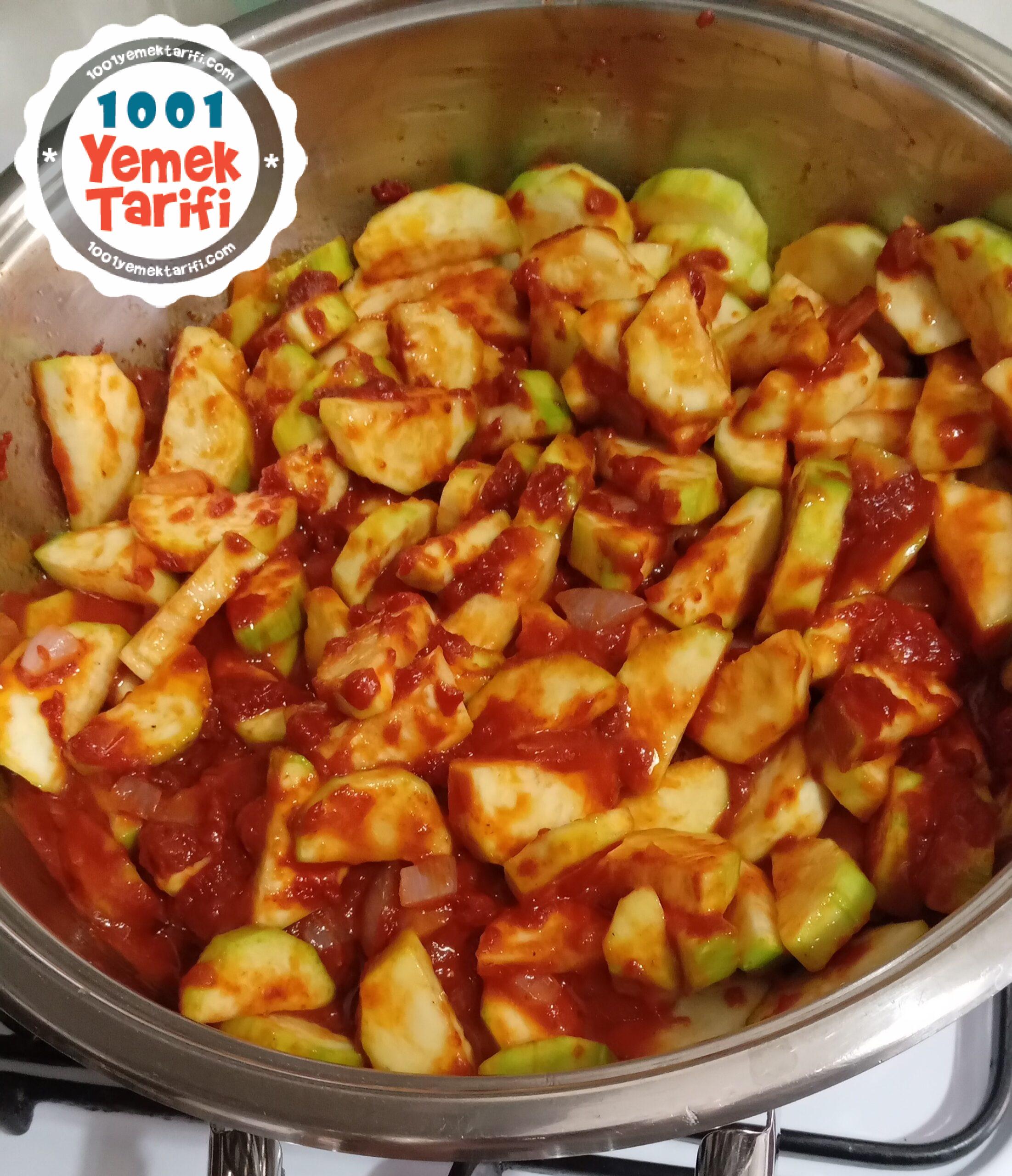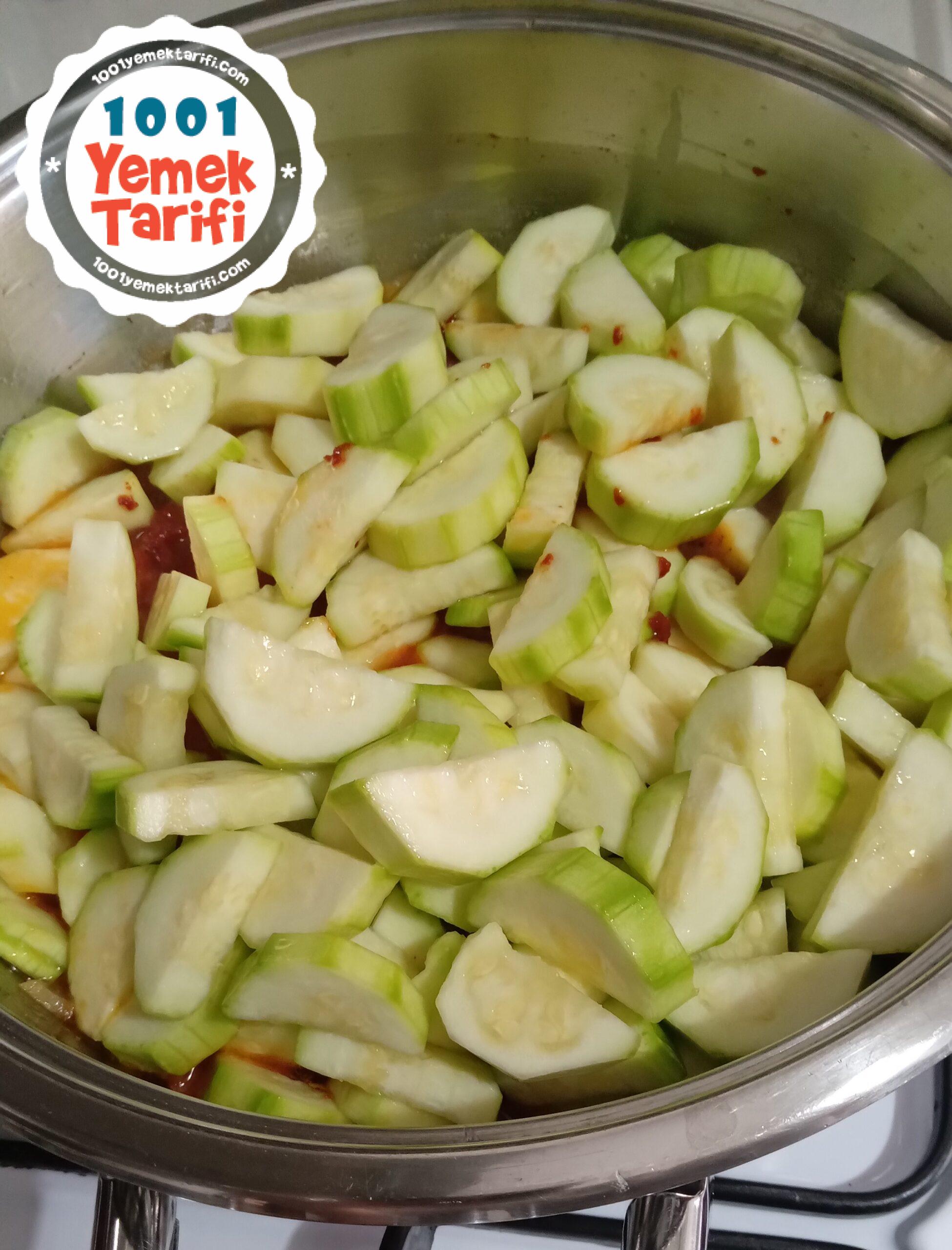 • Kavrulan harcımızın üzerine doğramış olduğumuz kabakları ekleyip, karıştırdıktan sonra kabaklarımızın biraz yumuşaması için tencerenin kapağını kapatıp 15 dakika pişmeye bırakıyoruz.