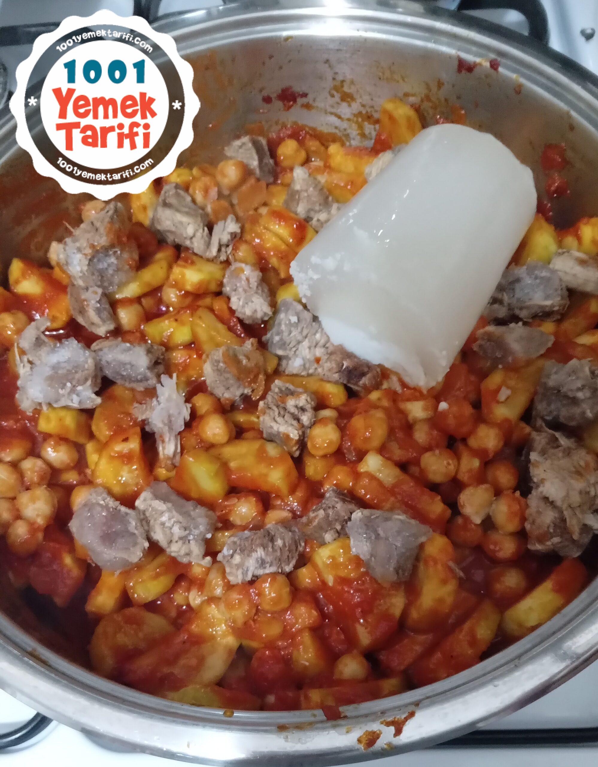 • Üzerine önceden pişmiş dana etimizi ekleyip, dondurulmuş 1 su bardağı kemik suyunu ve normal sıcak suyunu da ilave ettikten sonra tenceremizin kapağını kapatıyoruz ve kısık ateşte pişmeye bırakıyoruz.