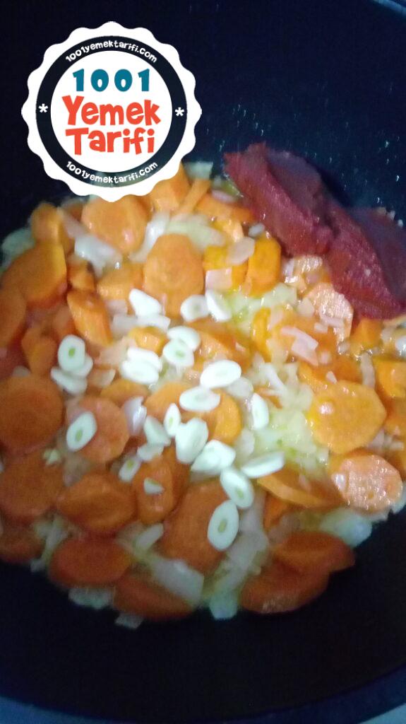 - Sıvıyağ koyduğumuz tenceremize yemeklik doğradığımız soğan ve yuvarlak kestiğimiz havuçları ekleyelim ve biraz renkleri dönene kadar kavuralım.