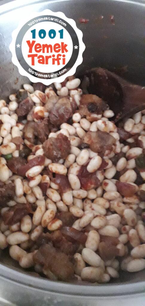 - Kuru fasulyeleri ekleyip bir kaç dakika kavrulduktan sonra