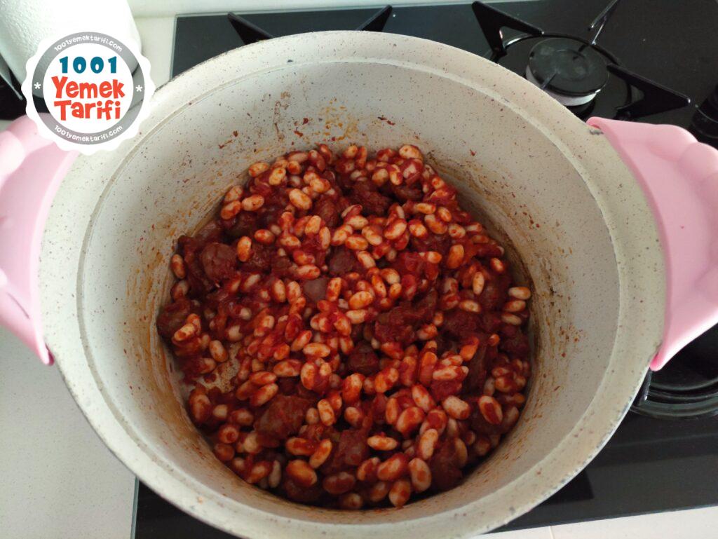 - *Fasulyeleri ekleyip karıştırdıktan sonra kaynar suyu ekleyip kısık ateşte kaynamaya bırakın. Afiyet olsun…