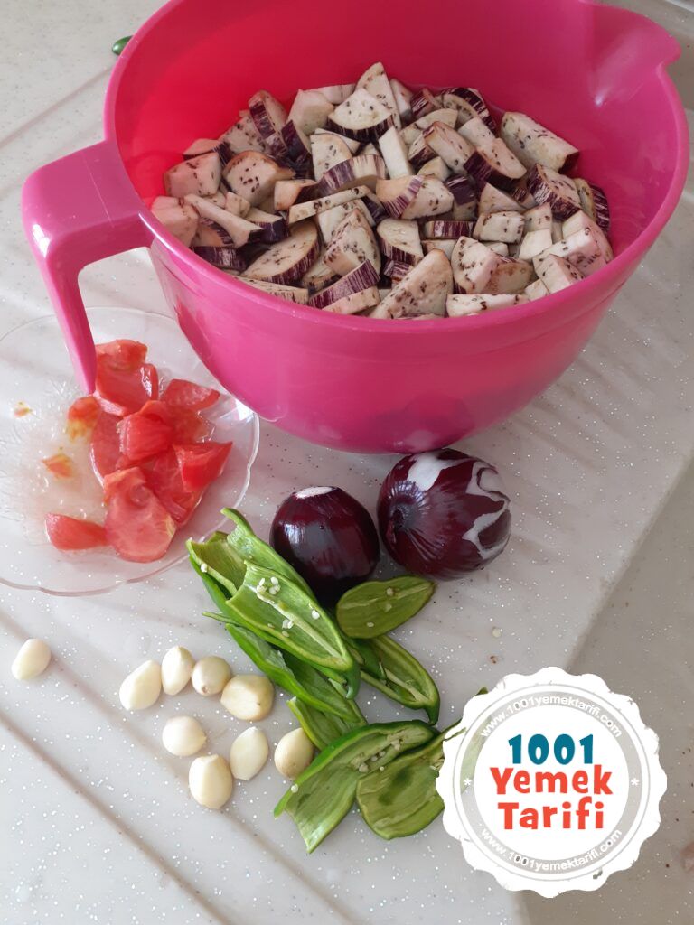 - Daha sonra sırasıyla yine küp küp doğradığımiz soğan sarımsak biber ve patlicanlarimizi bu sıra ile yerleştirelim.