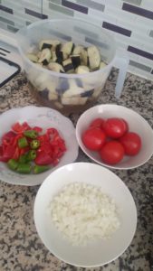 - Öncelikle tüm malzemeleri hazırlıyoruz ki pişirme aşamasında elimizin altında olsun ve patlıcanları da büyük büyük küpler halinde doğrayın ve tuzlu suda bekletin.