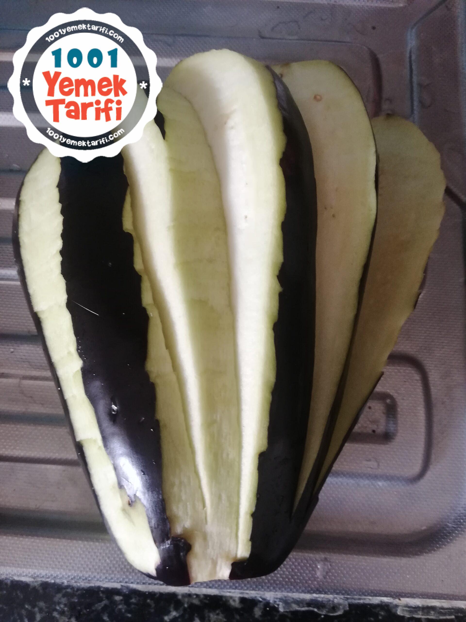 - Patlıcanları şerit şerit soyalım ve yelpaze şeklinde keselim.
