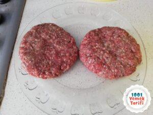 • Kıymayı derin bir kaba alalım üzerine rendelenmiş 1 adet soğanı ekleyelim. Tuz ve karabiber ekleyip biraz karıştırıp bırakalım. 4 parçaya bölelim ve her bir parçaya yuvarlak hamburger köftesi şekli verelim.