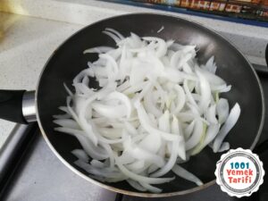 • Bir yandan karamelize soğan için bir tavaya bir çay kaşığı sıvı yağ koyalım ve üzerine 1 adet soğanı piyazlık doğrayıp ekleyelim.