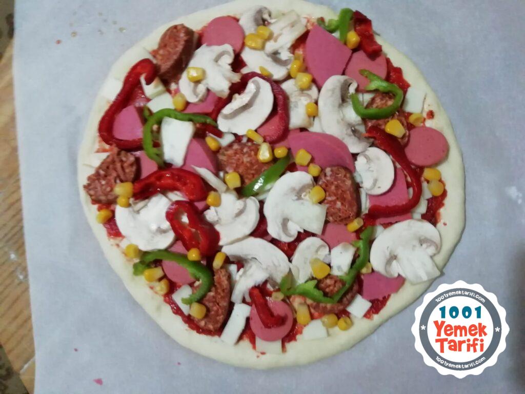 - Malzemeleri yerleştirdikten sonra en üste tekrar rendelenmiş kaşar ekleyip fırına koyup önceden ısıtılmış 200 derece fırında 20 dakika pişirin. Peynirler güzelce eriyip tüm malzemeler piştiğinde pizzanızı fırından çıkarabilirsiniz.