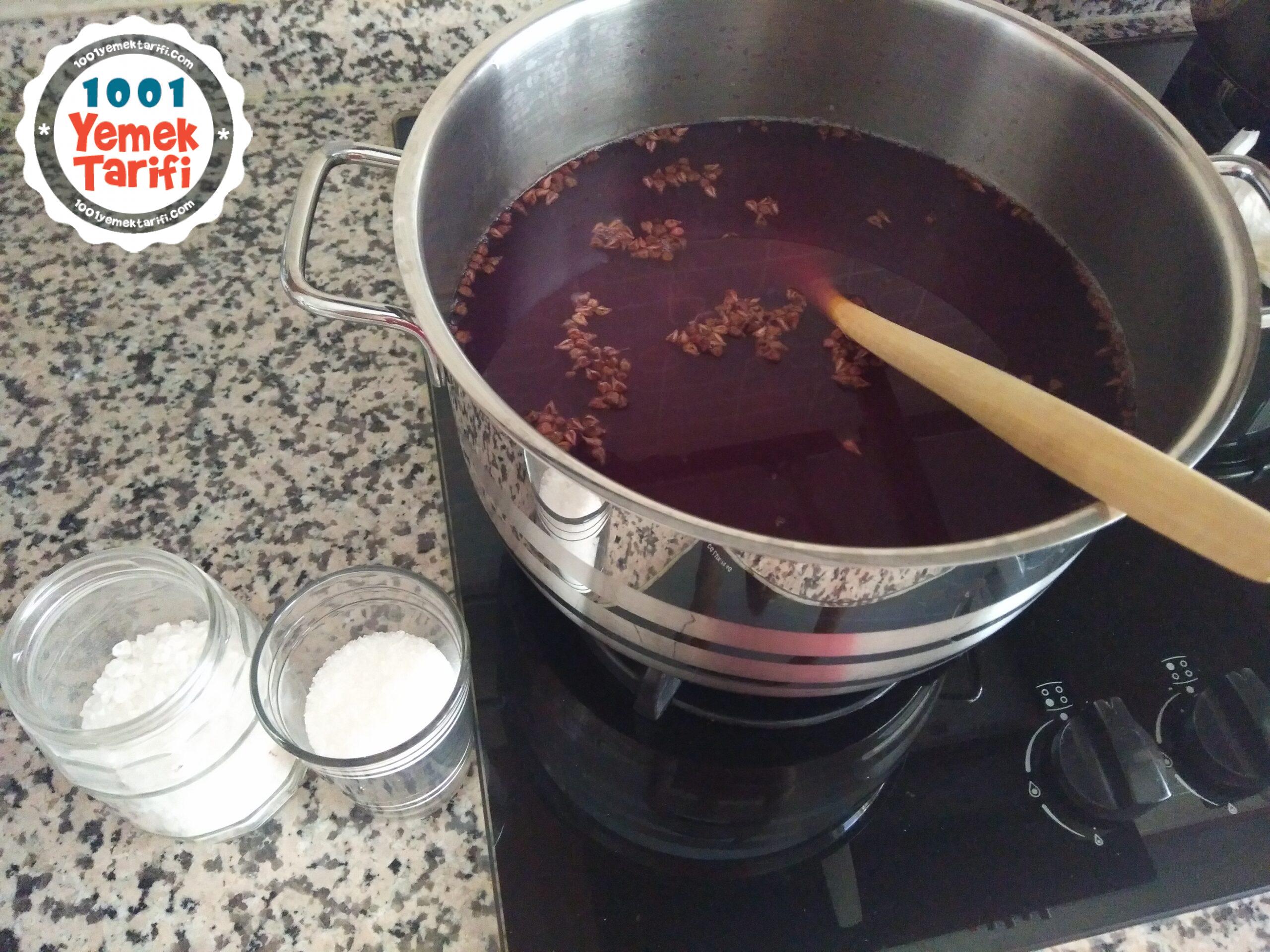 • Üzümler iyice piştikten sonra yaklaşık 3 litre su , şeker ve limon tuzunu ekledim ve 15-20 dakika daha kaynattım.