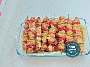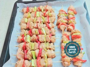 - Hazırlamış olduğumuz şişleri yağlı kağıt sermiş olduğumuz tepsimize dizelim ve 220 derecelik fırında alt üst pişirelim. İşte evde tavuk şiş kebap yapmak bu kadar kolay. Bu nefis tarifimi yapıp yiyeceklere afiyet olsun.