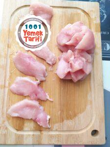 • Öncelikle tavuk göğüsleri ince geniş şekilde doğranır.