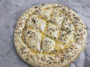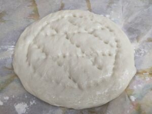 - 30 dk bekletmiş olduğumuz bezelerimize oklava veya merdane kulanmadan ellerimizi biraz yağlayarak hamura çok bastırmadan, şekil vererek, 10 dk bu şekilde bekletiyoruz. 10 dk dinlendirmiş olduğumuz pidelerimizin şekillerinin üzerinden ellerimizle tekrardan geçelim hamur iyice kabardığı için şekiller kaybolmamalı 🙂